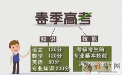 春季高考考试科目和分值为:专业技能230分、专业理论基础200分、语文120分、数学120分、英语80分(没有听力),总分值为750分www.ganlv5.com赶驴网。